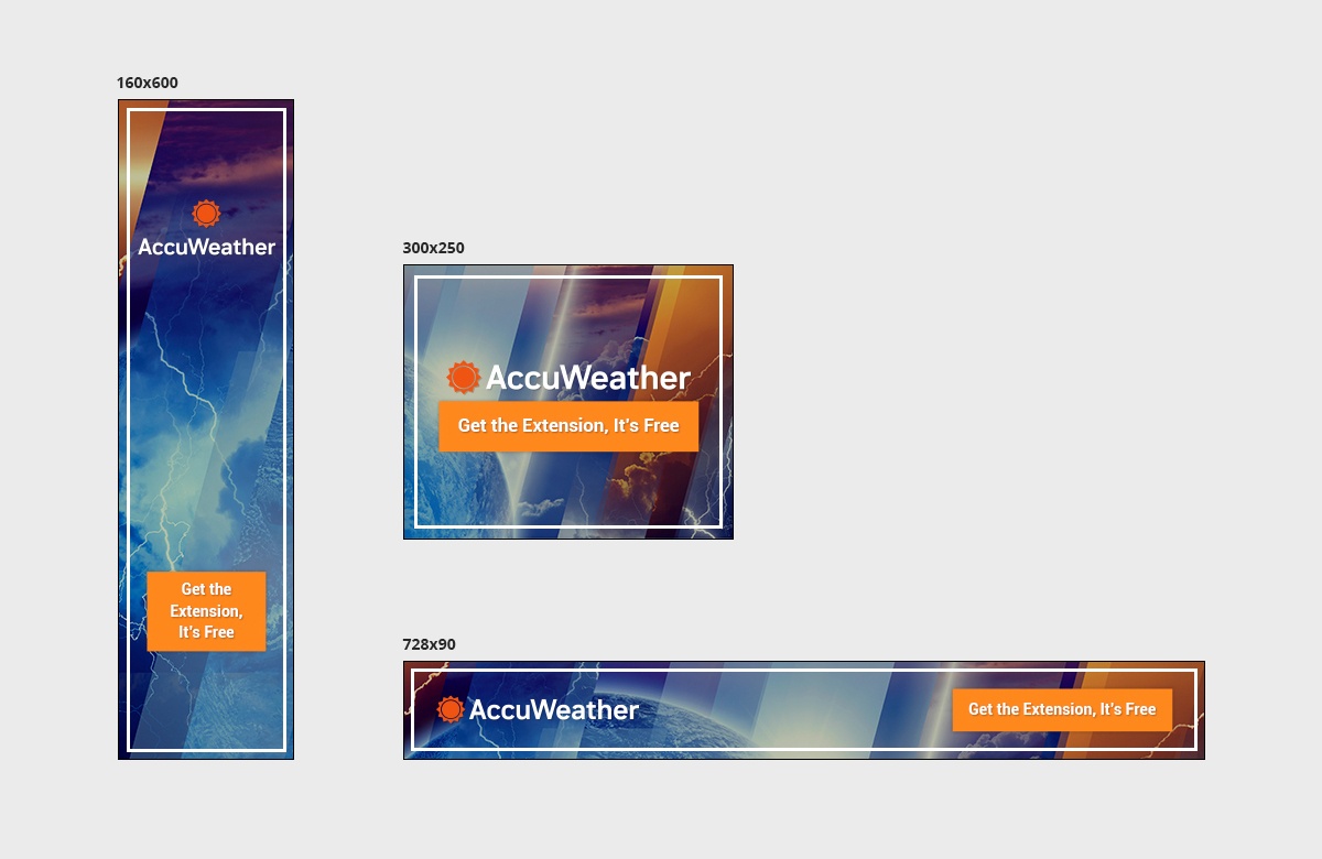 A banner mini set (160×600, 300×250 & 728×90), a long-form landing page, and an onboarding video created to introduce, inform, and acquire users for AccuWeather’s new browser extension. Once installed users were given easy access to live, customizable weather updates straight from their browser.